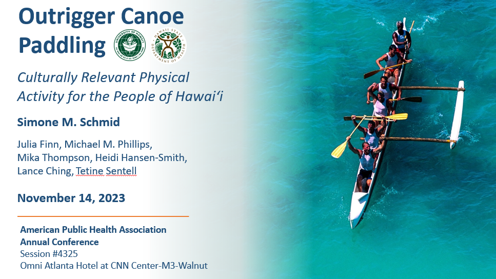 Sentell T, Thompson M, Rodericks R, Schmid S, Pirkle C, Ching L, Look M, Wu YY, Dudla S, Finn J, Phillips MM. Engagement in culturally-relevant physical activity (paddling, hula, surfing, and spearfishing) in the state of Hawai‘i over the lifecourse. American Public Health Association Conference. Atlanta, Georgia. November 2023.